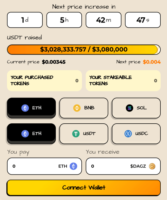 قیمت فعلی $DAWGZ در پیش فروش ۰.۰۰۳۴۵ دلار است و این پروژه تاکنون نزدیک به ۳ میلیون دلار جمع آوری کرده است که نشان دهنده اعتماد قوی سرمایه گذاران به ایده دموکراتیک کردن معاملات مبتنی بر هوش مصنوعی است.