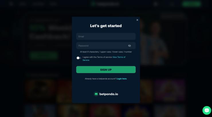 輸入您的電子郵件地址並選擇一個強密碼來註冊您的Betpanda帳戶。