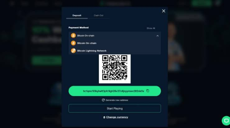 Instant Casino支援法幣與加密貨幣付款,允許你使用獨立的存款地址與行動錢包QR碼快速存入比特幣。無論付款方式為何,存款最低金額為20美元,而提款則會受到每日、每週及每月限額的限制。比特幣出金會即時處理,但你可能需要支付第三方手續費。