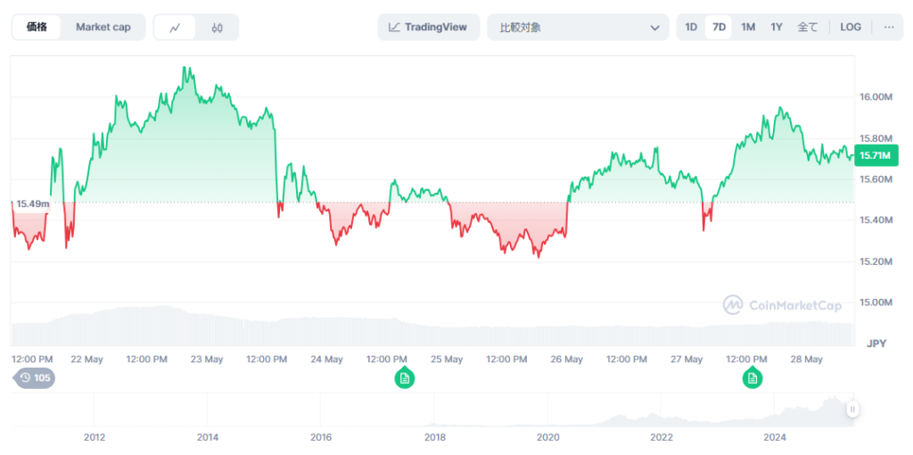 BTCは2024年12月に108,000ドル(約1,700万円)を記録後、2025年4月には76,000ドル(約1,200万円)まで下落したが、急速に回復。2025年5月22日には再び過去最高値となる111,970ドル(約1,770万円)を更新し、1か月で約50%上昇した。