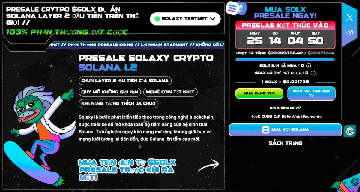 Nếu bạn vẫn đang cân nhắc băn khoăn, thì ở thời điểm hiện tại, presale Solaxy đang là top những đồng coin tiềm năng 2025 tốt nhất hiện tại. Với giải pháp tiện ích cho blockchain Solana, cùng lượng người dùng đông đảo, thành tích presale ấn tượng, $SOLX hứa hẹn sẽ bùng nổ sau khi được niêm yết trên các sàn giao dịch lớn.