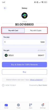 You may also choose to pay with your card. Just click the ‘Buy with card’ / ‘Buy with crypto’ option at the bottom of the presale widget to switch between options.