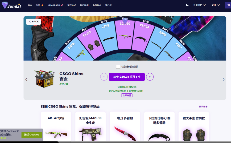 在Jemlit上可選擇多種神秘箱,涵蓋CSGO掉落箱與更廣泛的奢侈品獎品: