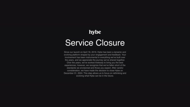 Over the years, we’ve worked tirelessly to bring you the best experiences, however, we recognize that we’ve fallen short of the standards we envisioned and those you expect. After careful consideration, we have made the decision to close Hybe on December 31, 2024. This step allows us to focus on rethinking and evolving what Hybe can be in the future.”