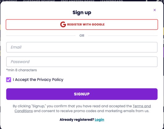 Once you’re in, you’ll land on your dashboard to explore available mystery boxes, check out any promotions, and view your account balance.
