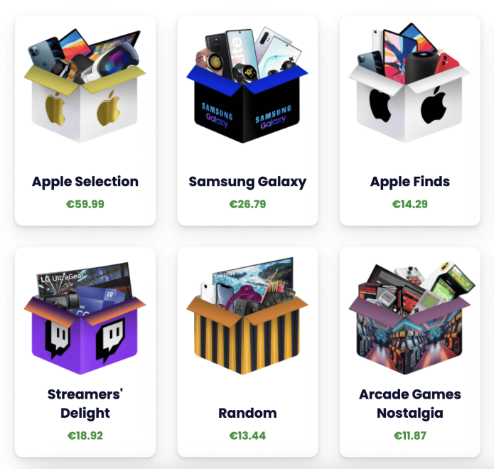 اختر فئة الصندوق المفضلة من بين الخيارات المتاحة مثل الإلكترونيات، الأزياء، أو الألعاب. اطّلع على تفاصيل كل صندوق واحتمالية ربح كل جائزة المعلنة مسبقًا.