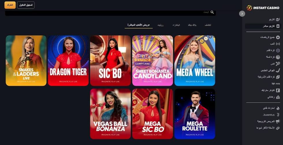 تقدم Instant Casino مجموعة واسعة من مسابقات ربح فوري مثل عروض الالعاب المباشرة، عجلة الحظ، البنغو الفوري وبطاقات الخدش مع نتائج فورية. تُعتبر منصة مثالية للالعاب المباشرة التفاعلية بفضل مولدات الأرقام العشوائية (RNG) المُعتمدة التي تضمن نزاهة النتائج.