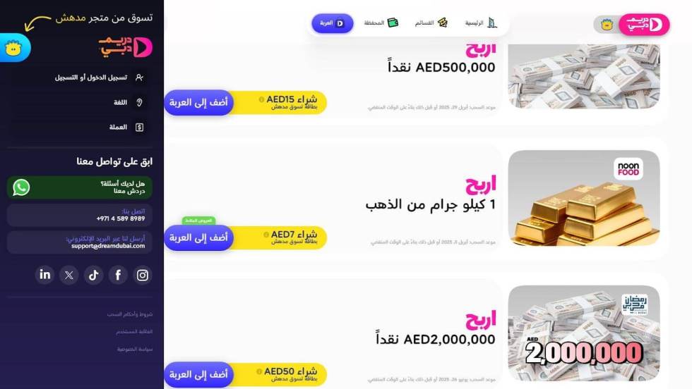 - DreamDubai.com: يقدم بطاقات تسوق مختلفة الأسعار لربح جوائز فورية مثل كيلو من الذهب أو أموال نقدية.
