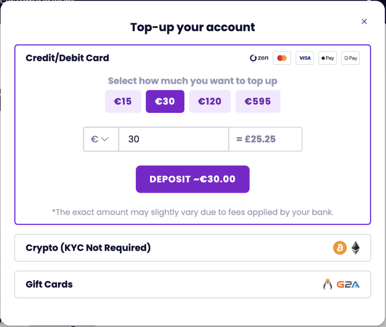 بعد التسجيل، قم بإيداع مبلغ مالي بحد أدنى 7.71 دولارات أو ما يعادلها بالعملة المحلية. تدعم المنصة طرق دفع متنوعة مثل فيزا، ماستركارد، أو العملات المشفرة.