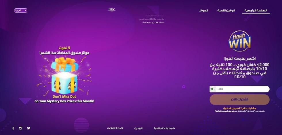 تُقدم FlashWin.net فرصة ربح 2,000$ نقدا و فوراً بمجرد الإجابة بشكل صحيح على 10 أسئلة خلال الوقت المخصص في جولة أسئلة لعبة فلاش وين. سيدخل المستخدم مرحلة “صندوق المفاجآت”، والتي تسمح باختيار جائزة إضافية أو مكافأة إضافية أو محاولة إضافية عبر اختيار صندوق واحد على الشاشة. المكافأة لا تحل محل الجائزة الفورية أو أي من الجوائز.