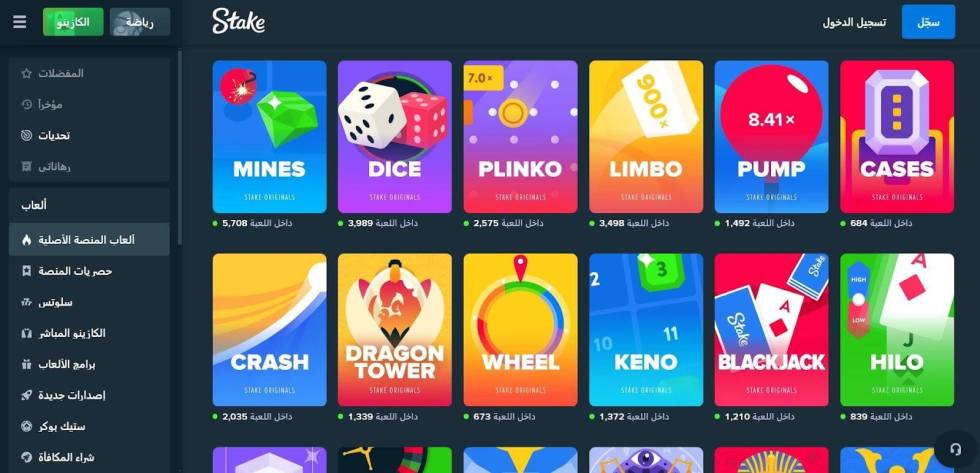 - Stake.com: خيار مثالي لألعاب المهارة والنتائج الفورية، مع دعم العملات المشفرة لسرعة السحب.