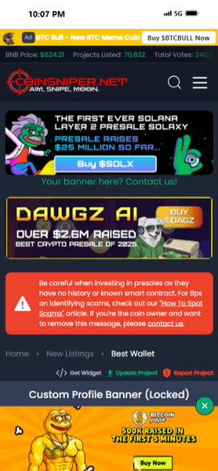 - CoinSniper: وهي واحدة من أبرز مجمعات اكتتاب عملات الميم، حيث توفر قائمة محدثة بالمشاريع الجديدة مع تقييمات المجتمع لكل مشروع. ويُمكن للمستخدمين التصويت للمشاريع المفضلة لديهم، مما يساعد في تحديد مدى شعبيتها وموثوقيتها.