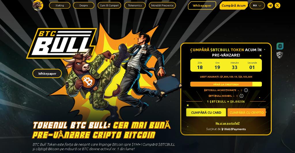 Prețul actual al tokenului $BTCBULL se situează în jurul valorii de 0,0026 USD, proiectul înregistrând un răspuns puternic în pre-vânzare și strângând în total peste 7 milioane de dolari.