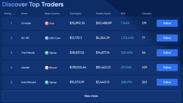 This board showcases each trader’s return on equity (ROE), total equity, and number of followers, helping you find a trader that matches your risk tolerance. You can then choose who to follow based on their strategy and past performance.