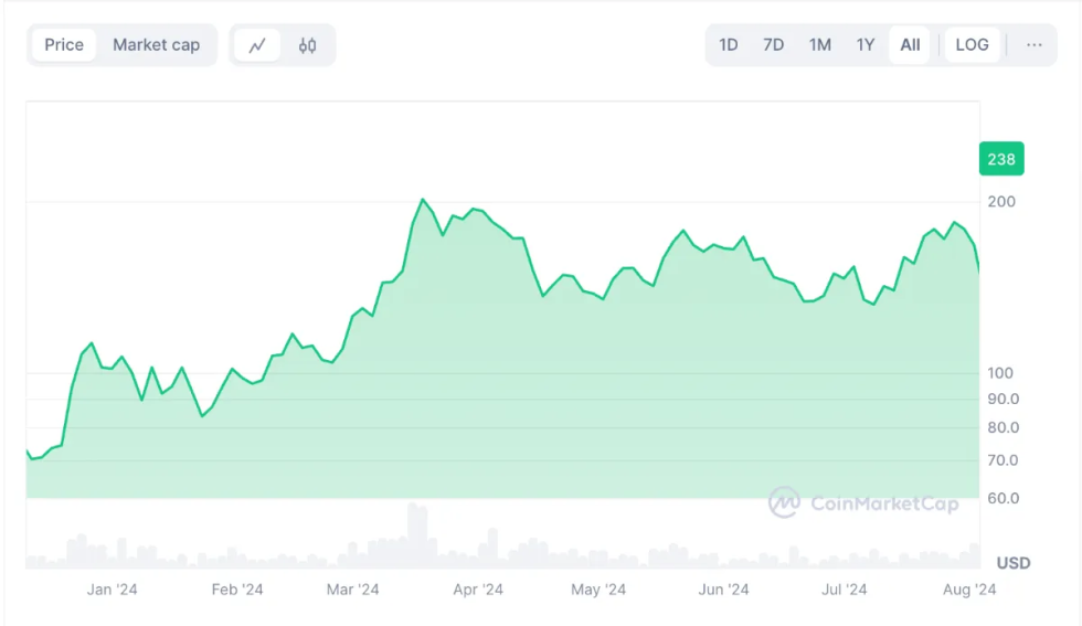 接下來的2023年,原本已被認為退場的SOL卻上演大逆轉,從年初不到10美元暴衝到年底109.55美元,全年漲幅高達997%。這波氣勢也延續到了2024年,當年11月更一度突破256美元大關。
