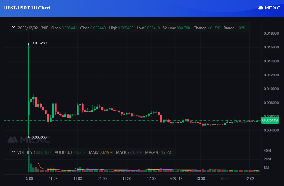 Od chvíle, kdy se začalo obchodovat na MEXC, BEST posílil o 74 %. Po krátkém období vybírání zisků se opět dostává do růstového módu.