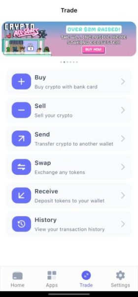Lietotne ļauj veikt visus nepieciešamos pasākumus, lai iegādātos jaunākās kriptovalūtas, tostarp pievienot maksājumu metodi un veikt pirkumu tieši lietotnē.