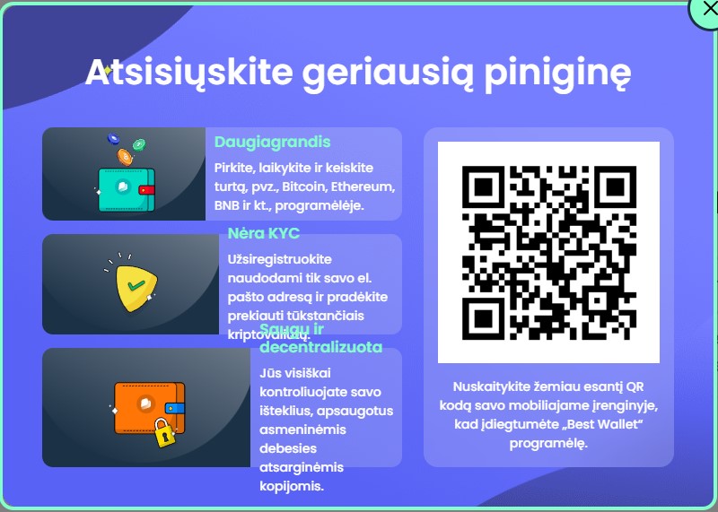 Dėl patogios sąsajos ir išmanių funkcijų Best Wallet tinka tiek pradedantiesiems, tiek patyrusiems investuotojams, norintiems pilnai kontroliuoti savo turtą be tarpininkų.