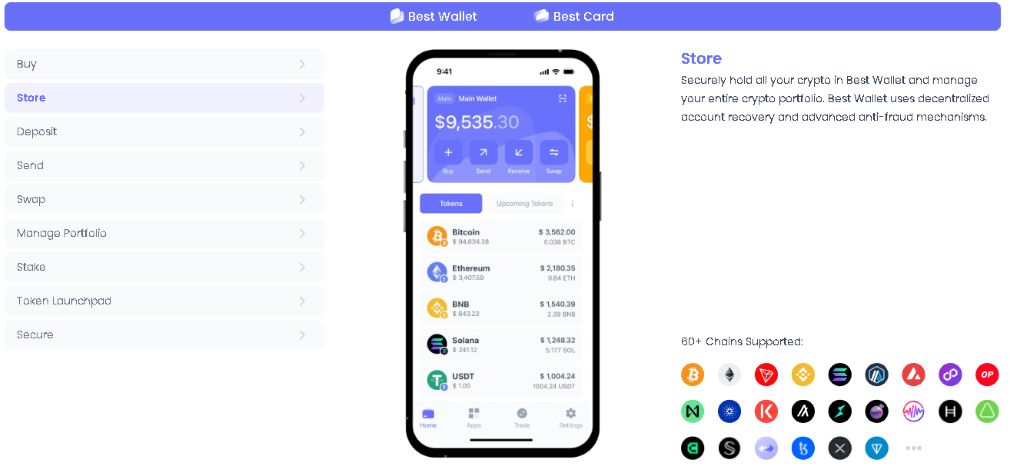 Best Wallet podržava više od 1.000 kriptovaluta i 60 blockchain mreža, što ga čini svestranim rješenjem za upravljanje digitalnim imovinama.
