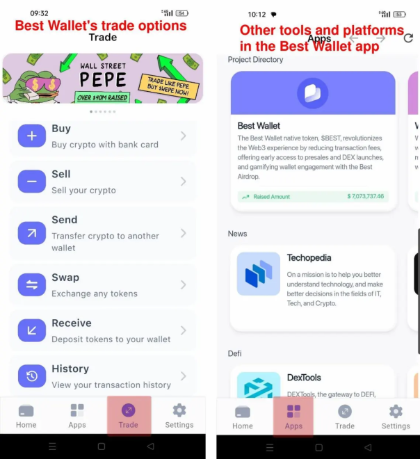 Best Wallet 透過整合 DeFi 工具和加密貨幣新聞平台,使您更輕鬆掌握最新的加密市場趨勢。目前,您可以在應用程式內訪問三個外部 DeFi 平台: