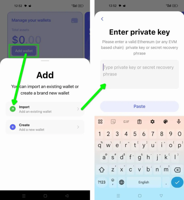 匯入新錢包時,您需要輸入該錢包的私鑰並確認。請記住,這僅適用於其他以太坊兼容錢包。要創建新錢包,只需按照步驟生成秘密恢復短語。然後,您可以在設定 > 管理錢包中找到所有錢包。