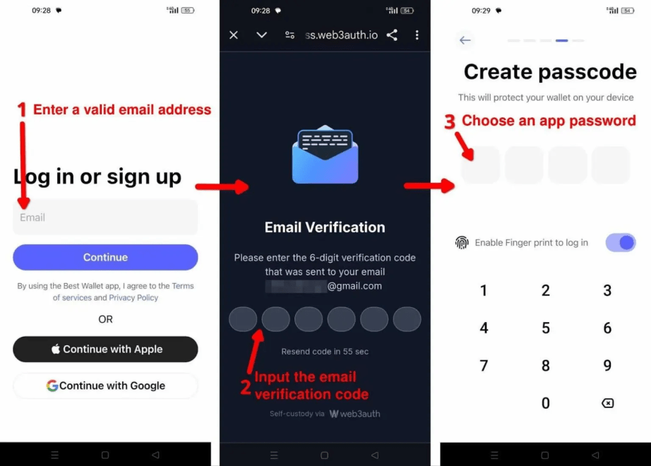 首先,從 Best Wallet 官方網站下載應用程式。點擊 Play 商店或 App Store 按鈕並安裝 Best Wallet。然後,打開應用程式並按照步驟操作。輸入有效的電子郵件地址並點擊「繼續」。使用電子郵件驗證碼確認您的電子郵件。
