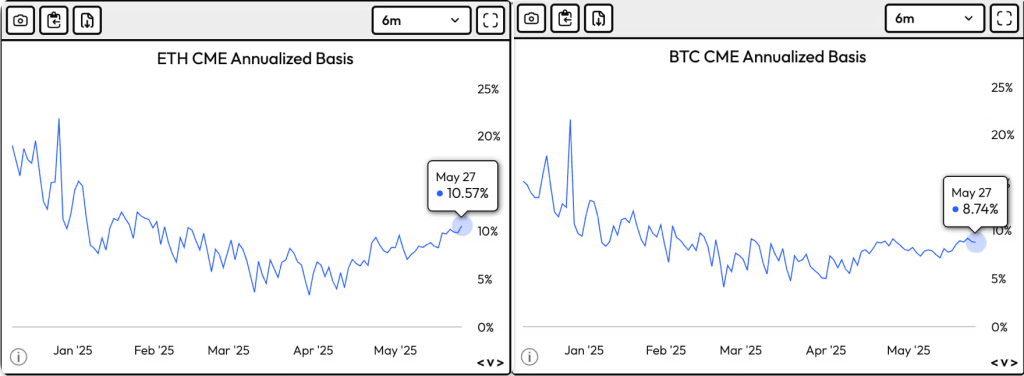 การดู Futures Premiums ก็เผยให้เห็นความโน้มเอียงต่อ ETH ได้ชัดเจนยิ่งขึ้น ณ ตอนนี้ One-month Ether Futures มี Premium ประจำปีอยู่ที่ 10.5% ซึ่งเป็นระดับสูงสุดตั้งแต่เดือนมกราคม ขณะที่ Bitcoin Futures Premium อยู่ที่ 8.74% Premium ที่สูงขึ้นแสดงถึงความเชื่อมั่นและความต้องการซื้อที่แข็งแกร่ง