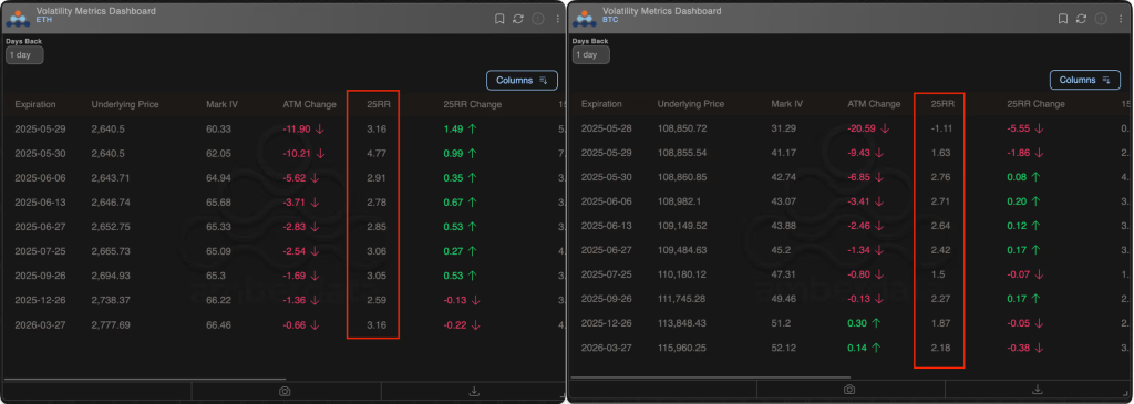 การวิเคราะห์ 25-delta Risk Reversals ซึ่งเป็นตัวชี้วัดความเชื่อมั่นที่ได้มาจากการเปรียบเทียบความต้องการระหว่าง Call Options และ Put Options พบว่าทั้ง Bitcoin และ Ethereum มีค่าเป็นบวก แสดงว่านักลงทุนโน้มเอียงไปทางการเดิมพันว่าราคาจะขึ้น แต่ ETH Risk Reversals มีราคาแพงกว่า BTC อย่างชัดเจน