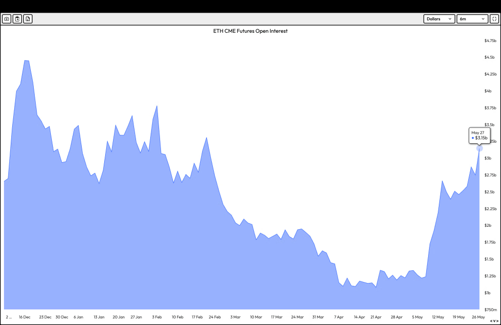 ในทางตรงกันข้าม Open Interest ของ ETH กลับเพิ่มขึ้นแบบก้าวกระโดด 186% เป็น 3.15 พันล้านดอลลาร์ตั้งแต่ช่วงเดือนเมษายน และที่น่าสนใจคือการเติบโตนี้เร่งตัวขึ้นในช่วง 2 สัปดาห์ล่าสุด แนวโน้มที่ต่างกันนี้แสดงให้เห็นชัดเจนว่าสถาบันการเงินกำลังหันไปสนใจ ETH มากขึ้น