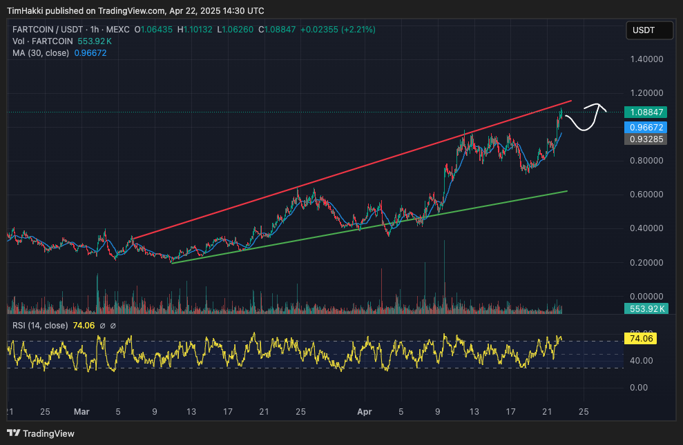 Fartcoinは現在1.08ドル(約150円)付近で取引されており、過去24時間で21.4%の急騰を見せた。