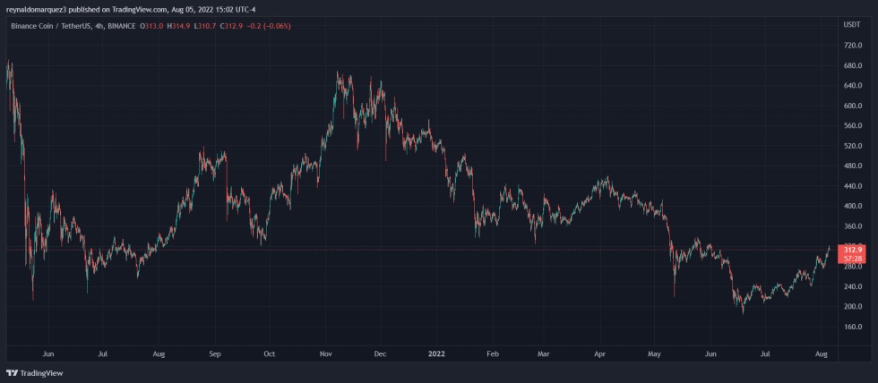 At the time of writing, BNB’s price trades at $313 with minor gains on the 4-hour chart.