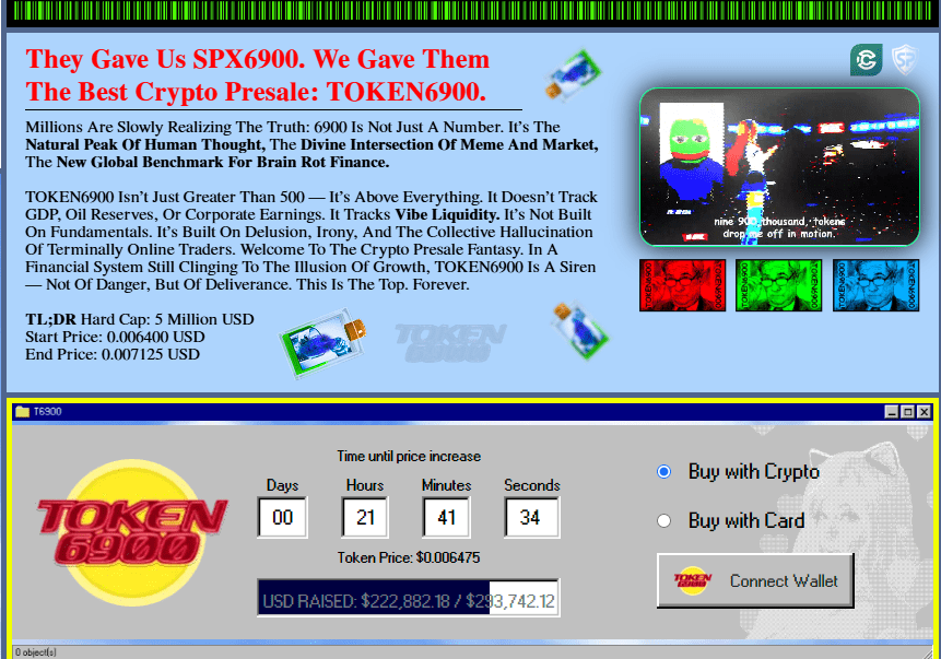 TOKEN6900 ($T6900) ir jauns uz Ethereum balstīts mēmu tokens, kas nepretendē uz lietderību – tas ir veltīts humora un kopienas atmosfērai. Projekts sevi jocīgi dēvē par „smadzeņu atrofijas finanšu etalonu”, norādot uz satīru par kriptovalūtu popularitātes ciklu. Jāatzīmē, ka TOKEN6900 kopējais piedāvājums ir 930 993 091, kas ir tieši par vienu vairāk nekā konkurējošajam mēmu žetonam SPX6900 – ironisks solis, lai ar vienu žetonu pierādītu savu pārākumu.