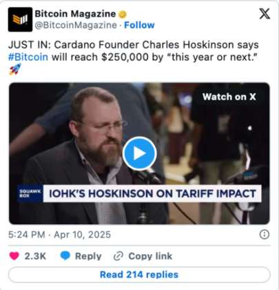 Con un precio actual en torno a los 80.000 dólares, Bitcoin ($BTC) aún tiene mucho camino por recorrer antes de alcanzar su máximo histórico de casi 110.000 dólares, y más aún para llegar a los 250.000 dólares. Sin embargo, para el fundador de Cardano, Charles Hoskinson, ese ambicioso objetivo sigue siendo posible en 2025.