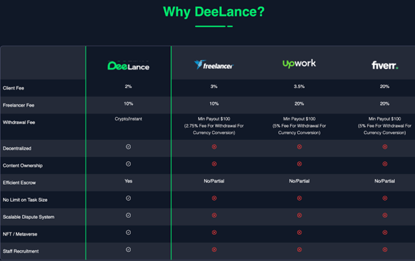 - Work submitted on DeeLance is turned into NFTs, mitigating copyright violations.