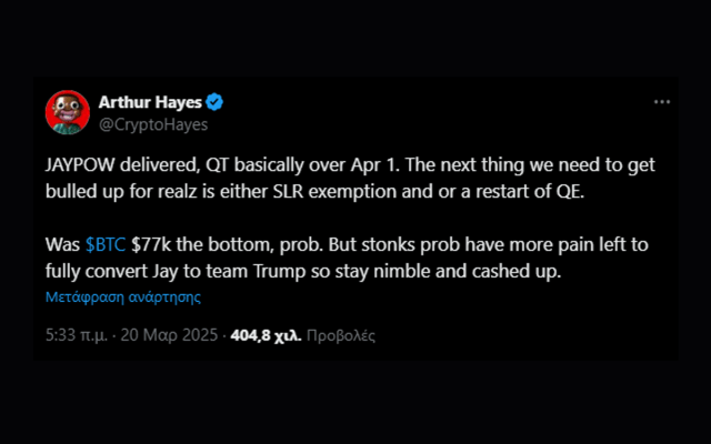 Ο συνιδρυτής του BitMEX, Arthur Hayes, συμμερίζεται την αισιοδοξία, αλλά βασίζει τις προσδοκίες του περισσότερο στη νομισματική πολιτική. Σε πρόσφατη ανάρτησή του υποστήριξε ότι, αν η Fed επιστρέψει σε ποσοτική χαλάρωση ή άρει τους κανονισμούς SLR για τις τράπεζες, τότε η εισροή ρευστότητας θα ωθήσει το Bitcoin σε νέα υψηλά.
