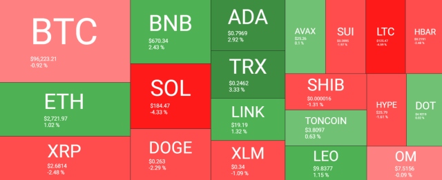 Dalam 24 jam terakhir, pasar crypto mengalami tekanan yang cukup kuat. Sebagian besar aset digital utama mengalami penurunan signifikan, termasuk Bitcoin (BTC) yang turun ke level $96.000.