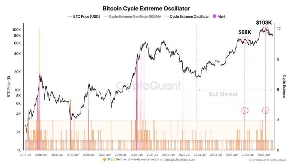 Several analysts believe BTC is on the verge of a breakout. Adler, who recently shared an analysis on X, highlighted two key extremes in this cycle: $68,000 and $103,000. These levels have acted as significant pivot zones and define the boundaries of Bitcoin’s range in this macro trend. According to Adler, the Bitcoin Cycle Extreme Oscillator tends to flash overbought signals when it rises above 3, often preceding local tops. Currently, that oscillator remains at low levels, suggesting that the market still has ample room to grow before reaching an overheated state.