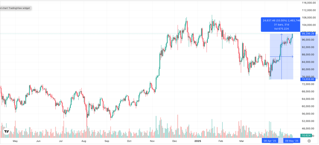 Vom Tiefpunkt, der bei rund 74.000 Dollar erreicht wurde, ist der Bitcoin-Kurs bereits um über 30 % gestiegen. Das Allzeithoch rückt damit wieder in greifbare Nähe. Während man am Aktienmarkt weitere Eskalationen im Handelskrieg zwischen den USA und China fürchtet, sind Kryptowährungen davon nicht betroffen, was sich auch weiterhin positiv auswirken dürfte.