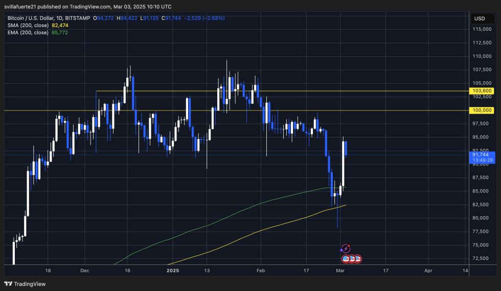 Bitcoin has experienced massive volatility over the past few days, with extreme price swings shaking the market. The cryptocurrency saw a sharp decline from $96K last Monday to a low of $78K on Friday, marking an 18% retrace. This rapid drop fueled speculation about a potential bear market, with fear dominating investor sentiment. However, in a dramatic reversal, Bitcoin rebounded aggressively yesterday, surging over 11% in just hours to reclaim the $95K level.