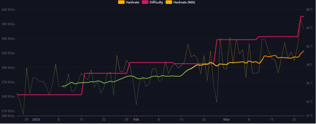 The Bitcoin hashrate has been consistently increasing since the beginning of the year. Earlier in the week, the network added 40 EH/s hashrate reaching a peak of 350 EH/s. However, hours after the mining difficulty was adjusted on March 23, the hashrate spiked to astronomical levels. Between March 23rd and March 24th, the bitcoin hashrate recorded a new high of 400 EH/s, according to data from Mempool.