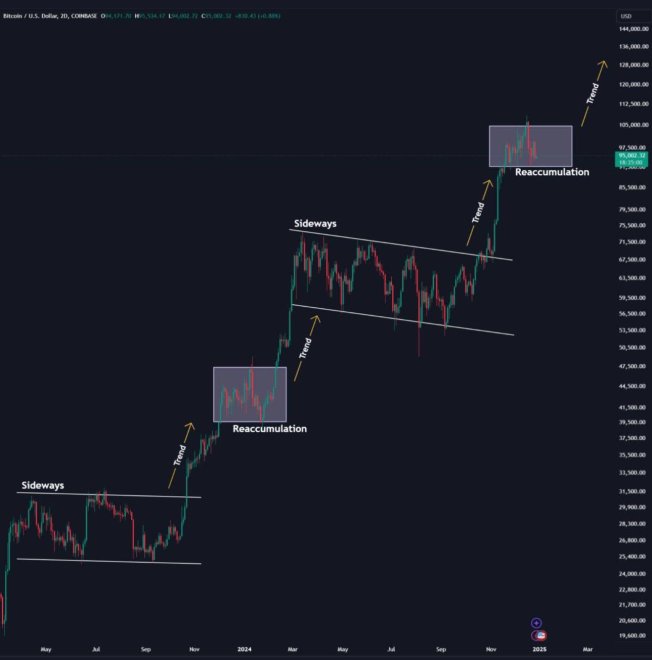Another crypto trader, Jelle, highlighted similarities between BTC’s price action in 2023-2024 and 2024-2025. Jelle pointed to a chart fractal that broke out to the upside in 2023-2024, suggesting that a similar trajectory could propel BTC to as high as $143,000.