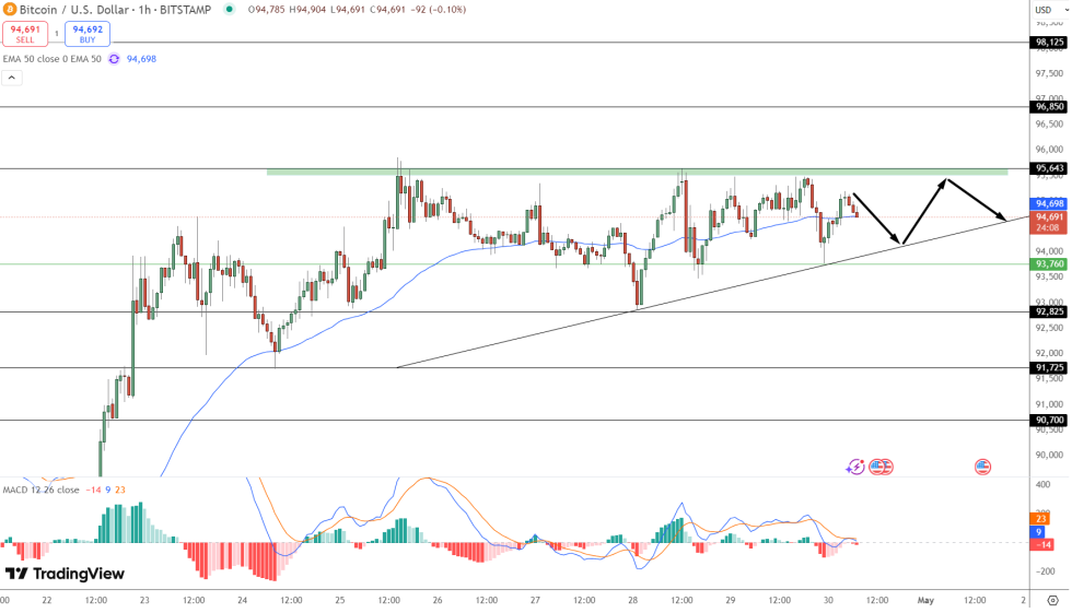 Se Bitcoin non riuscisse a risalire oltre i 95.643 dollari e scivolasse verso i 93.760 dollari, i trader potrebbero entrare nel mercato vicino alla trend line, impostando uno stop loss sotto i 93.000 dollari.