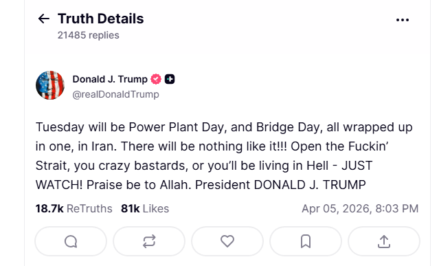 US President Donald Trump added to the tension with a new warning for Iran. In a post on Truth Social, he said Iran would be “living in Hell” if the Strait of Hormuz is not reopened, and he set a fresh deadline, saying the country now has until Tuesday or face attacks on its power plants and bridges.