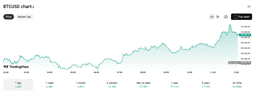 Momenteel staat de Bitcoin koers op $109.902,12 na een stijging van 2,38% in de afgelopen week.