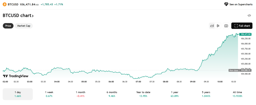 De Bitcoin koers beweegt op dit moment rond de $106.471. Het schommelt daarmee netjes boven de psychologische grens van $100.000. Belangrijke niveaus om goed in de gaten te houden zijn $106.000 als eerste serieuze weerstand en $102.000 als stevige ondersteuning. Op dit laatste kan de Bitcoin koers terugvallen zonder dat er direct paniek ontstaat. Breekt Bitcoin overtuigend voor een langere tijd door de bovengrens heen, dan kan dat de deur openen naar een nieuwe opwaartse beweging.