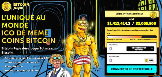 Bitcoin Pepe fait sensation depuis le lancement de sa prévente, attirant une vague d’investisseurs désireux d’investir dans ce nouveau projet dès la première phase. Celui-ci vise à transformer Bitcoin en une véritable plateforme de trading de memes, en combinant la sécurité du réseau BTC avec la rapidité et l’accessibilité de Solana.