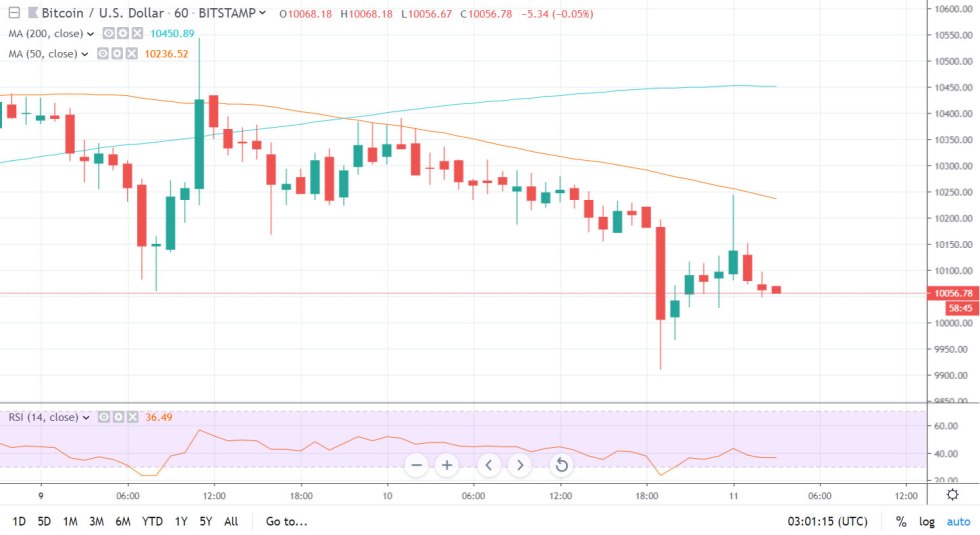 A death cross formed on the one hour chart earlier this week and as if in response, the downtrend intensified. Yesterday saw a slow but steady decline until one fat red candle dumped BTC all the way back to $9,900 according to Tradingview.com.