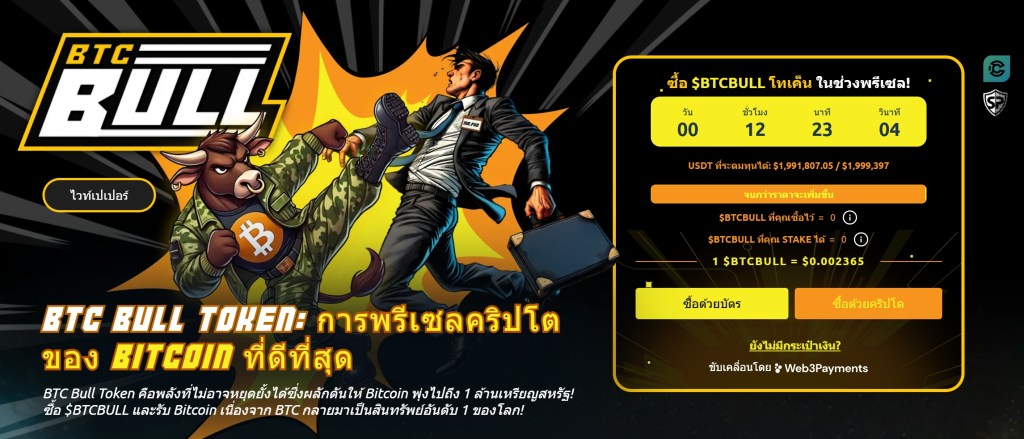 BTC Bull Token ($BTCBULL) เป็นเหรียญมีมใหม่บนเครือข่าย Ethereum ที่ผูกความสำเร็จเข้ากับการเติบโตของ Bitcoin โดยมอบรางวัลพิเศษให้ผู้ถือโทเค็นผ่านการแจก BTC แบบแอร์ดรอป การเผาโทเค็นตามเป้าหมาย และระบบ Staking ที่ให้ผลตอบแทน APY สูงถึง 1,710% โครงการนี้ได้ระดมทุนไปแล้วกว่า 1.99 ล้านดอลลาร์ในช่วงพรีเซล