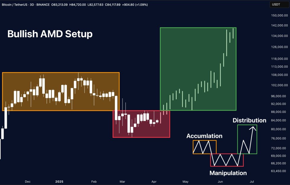 Offering a bullish perspective, crypto trader Merlijn The Trader suggested that BTC has completed the accumulation, manipulation, and distribution (AMD) setup. According to this view, the leading digital asset is now set to enter the final phase of the setup, potentially leading to a significant price surge.