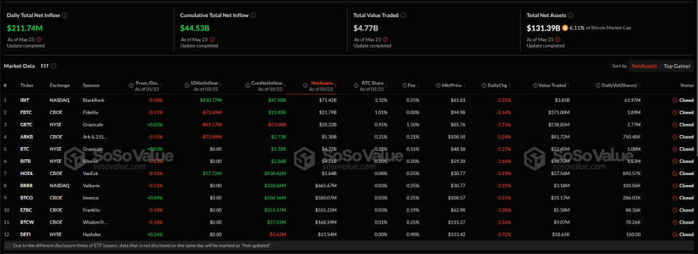 ข้อมูลล่าสุดจาก SosoValue ณ วันที่ 23 พฤษภาคม แสดงให้เห็นว่ามีการซื้อ Bitcoin ETF แบบ spot กว่า $211 ล้าน ซึ่งส่วนใหญ่มาจาก BlackRock ในขณะเดียวกันผู้ให้บริการรายอื่น เช่น Fidelity และ Grayscale กลับมีเงินทุนไหลออก